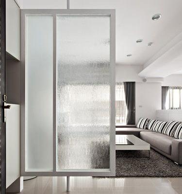 该形式设计用大屏玻璃作装饰遮隔,或在夹板贴面旁嵌饰喷砂玻璃、压花玻璃等通透的材料,既可以分隔大空间,又能保持整体空间的完整性。