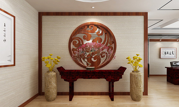 该形式以隔断下部为完全遮蔽式设计。隔断两侧隐蔽无法通透,上端敞开,贯通彼此相连的天花顶棚。通过线条的凹凸变化,墙面挂置壁饰或采用浮雕等装饰物的布置,从而达到浓厚的艺术效果 。